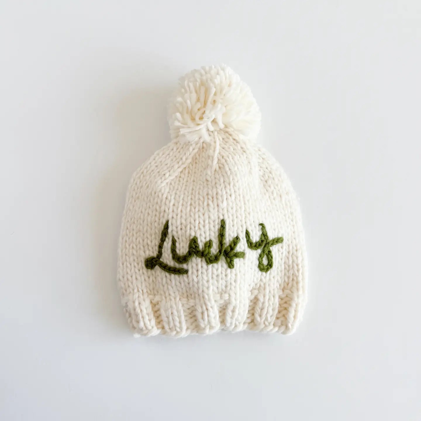 This cream-colored hat is hand-knit, accented with "lucky" in hand-embroidered script. Create the cutest St. Patty's outfit and style your little one with the love and luck. Match with our Clover Cardigan for a fun outfit. - Designed in Salt Lake City - Crafted with care using 100% hand-knit Acrylic
