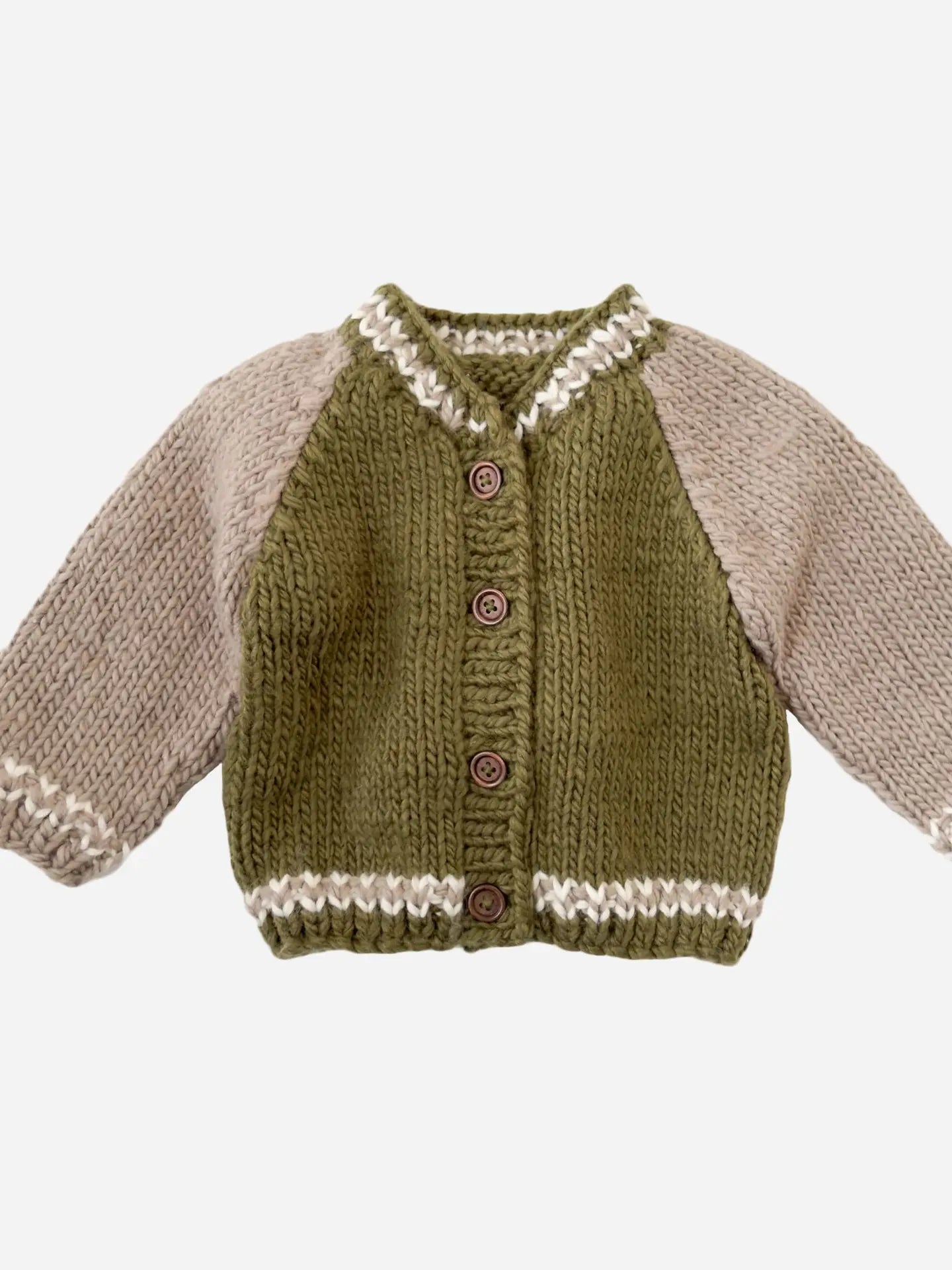 Get your head in the game with our Varsity cardigan in Moss. Featuring Flax sleeves and Cream trim, this sporty cardigan is the perfect fall outfit. Pair with matching beanie. Hand wash and lay flat to dry.